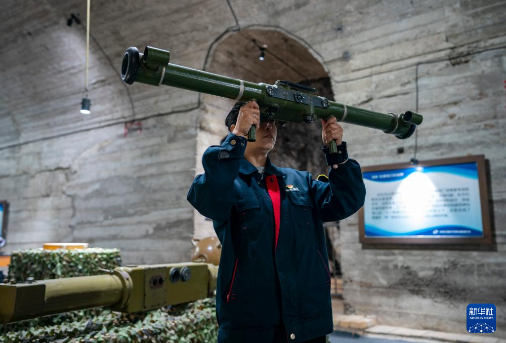 5月16日,一名工作人員在中國光學歷史博物館內展示對空測距機使用方法。