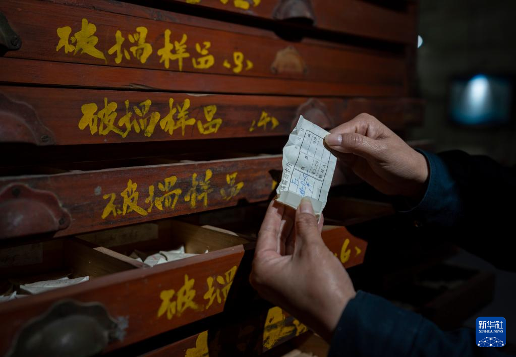 5月16日,工作人員在展示玻璃樣品柜內的一個玻璃樣品。