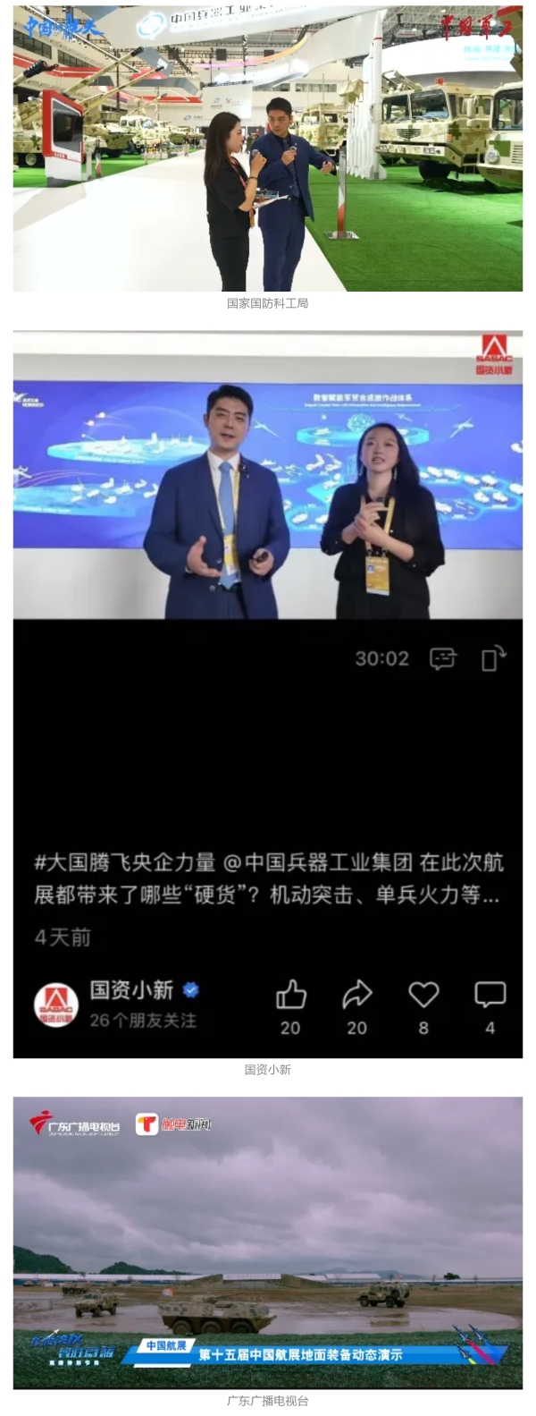 11月13日央視新聞《藍天之約》直播地面裝備動態演示此次航展,央視綜合頻道《新聞聯播》《晚間新聞》、新聞頻道《新聞直播間》《新聞30分》《朝聞天下》《共同關注》《東方時空》《午夜新聞》、財經頻道《天下財經》《經濟信息聯播》《正點財經》《第一時間》、中文國際頻道《今日環球》《中國新聞》、國防軍事頻道《軍事報道》《正午國防軍事》《國防軍事早報》《軍迷行天下》等欄目共播出兵器工業集團參展相關新聞報道40余條。11月10日央視新聞頻道《新聞30分》11月10日央視中文國際頻道《中國新聞》11月10日央視國防軍事頻道《軍事報道》11月11日央視國防軍事頻道《正午國防軍事》